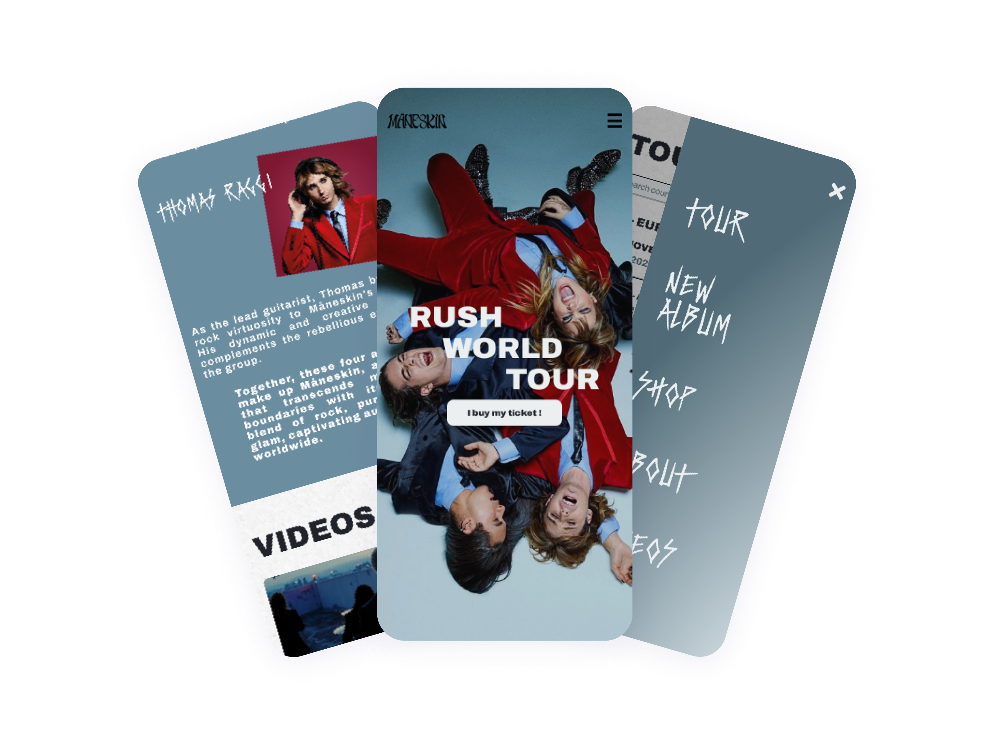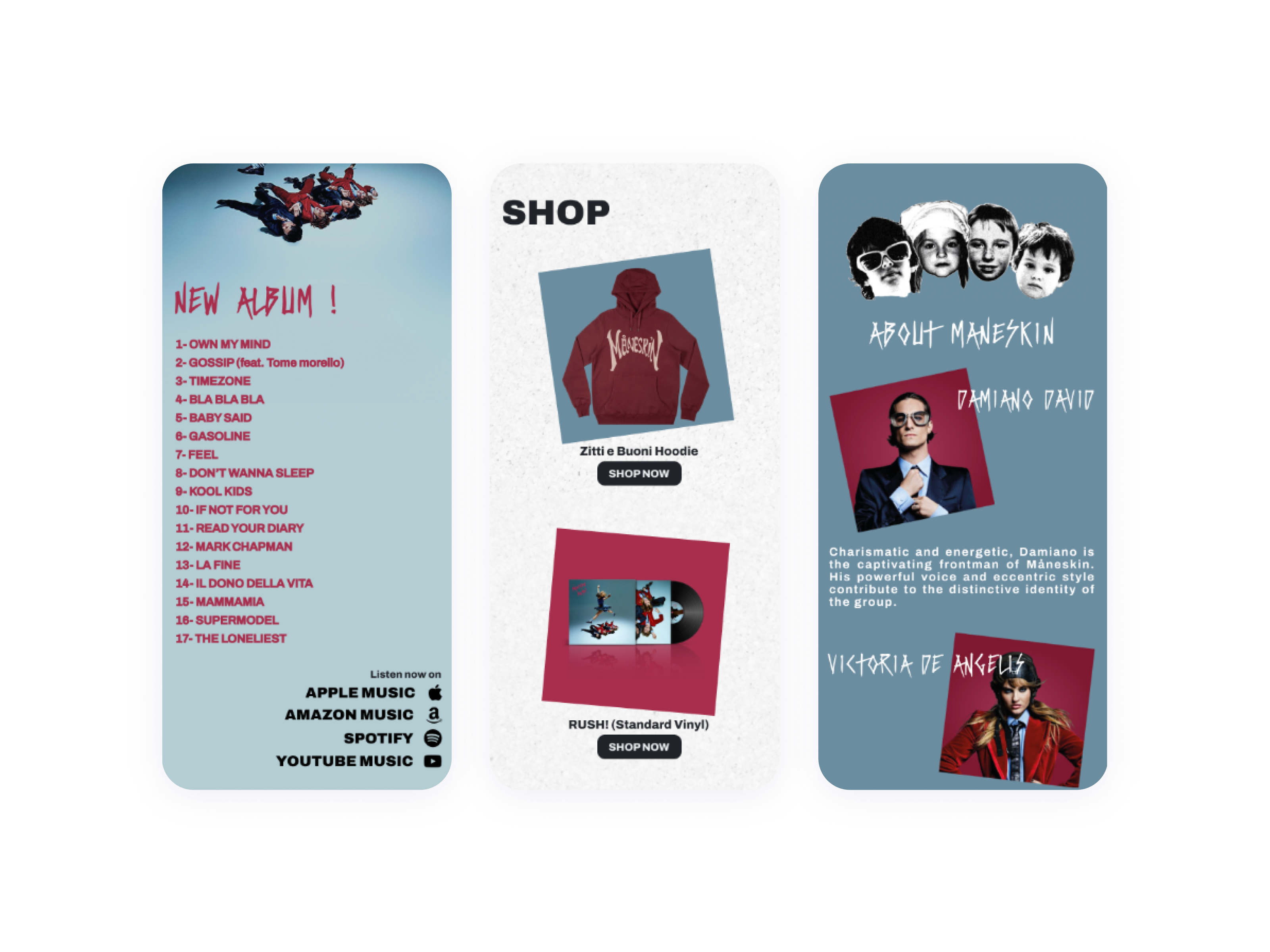 Compréhension de la direction artistique du dernier album et création de différents assets pour la maquette. La reprise de la DA permet d’apporter une réelle expérience utilisateur, un voyage au sein de leur création.
